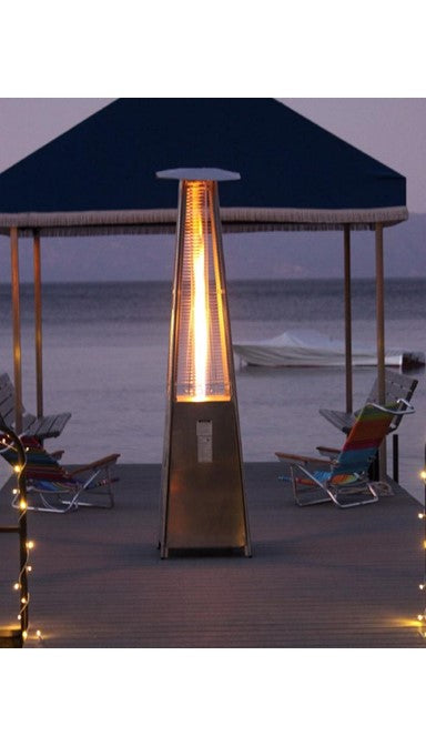 The latest in design and heat, the Stainless Steel Quartz Glass Tube Flame Heater brings style to outdoor heating. Its unique, visually mesmerizing flame provides heat in every direction. Watch your friends gather around this beautiful piece of patio art. A safety valve shuts it off automatically if tilted. Attached wheels make moving a snap. One-year manufacturer's warranty. Add cozy warmth anywhere.