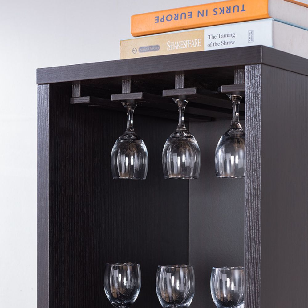 This bar unit includes one open storage area that is perfect for showcasing home décor, bar accessories, or frequently used items within easy reach. A dedicated wine glass storage area keeps stemware neatly organized and accessible, while the abstract wine bottle compartment adds a modern design element and securely holds up to four wine bottles. Completing the storage options is a bottom cabinet that offers concealed space for additional bar essentials, such as mixers, glassware, or serving pieces, helping you maintain a clean and uncluttered look.