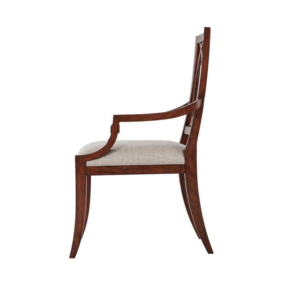 A mahogany lattice back armchair, the rectangular back enclosing a lattice of interlacing C's above an upholstered drop-in seat, on square tapering legs. Inspired by an Empire original.