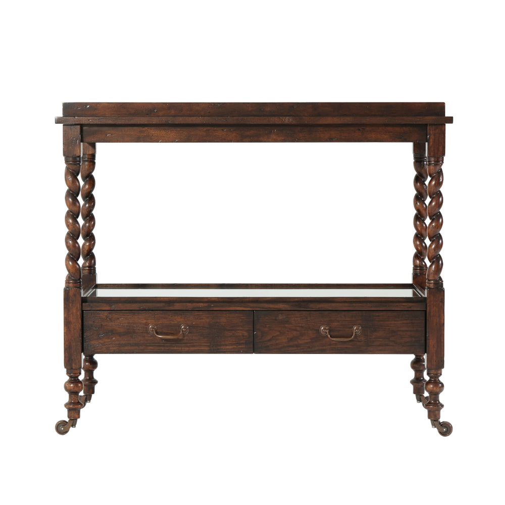 A mahogany and reclaimed oak veneered serving table, the galleried top and undertaker with glass overlay, on spiral turned legs joined by an undertier fitted with two drawers, on turned legs with brass castors.